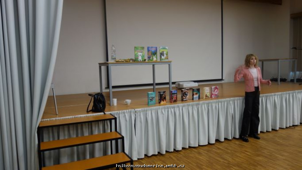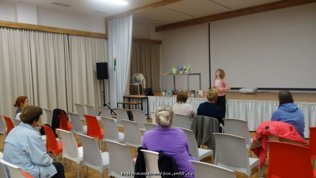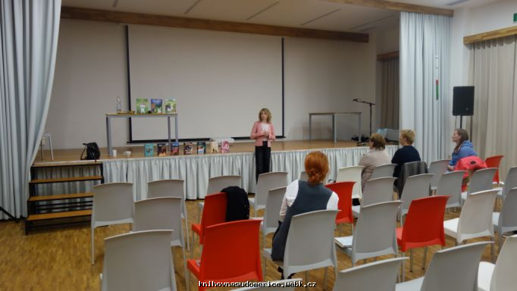 Ve středu 24.9. proběhlo ve Společenském centru Sudomír setkání se spisovatelkou Markétou Harasimovou pro dospělou veřejnost. Vyprávěla účastníkům besedy o své spisovatelské, scénáristické i nakladatelské činnosti. Představila jim své knihy a povyprávěla historky z prostředí vinařského nebo policejního, ve kterých získala inspiraci pro své knihy. Přivezla sebou také svoje knihy k zakoupení a někteří hosté si je koupili. Součástí programu večera byla i burza vyřazených a darovaných knih z naší knihovny. Jako poděkování dostala kytici květin a informační leták o naší obci, aby měla na nás malou vzpomínku.